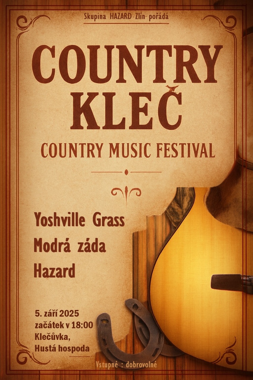 Zveme tedy všechny příznivce country a bluegrassu na náš COUNTRY KLEČ na Klečůvku u Zlína. Všechno se to odehraje v sále Husté hospody. O něco na zub a pitný režim se postará místní personál. Pro tentokrát je vstupné dobrovolné. A ještě kdy : 5. září 2025 v 18-22 hodin.